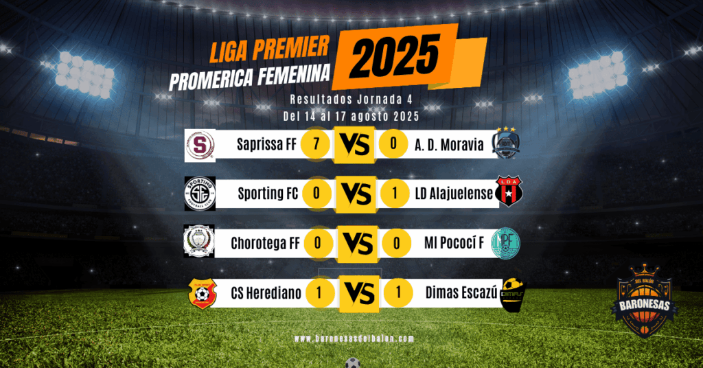 La Liga Premier Promerica Femenina Apertura 2025 vivió una cuarta jornada vibrante, con goleadas, partidos cerrados y la confirmación de que el campeonato será más reñido que nunca. El protagonismo se lo llevó Saprissa FF, que firmó la victoria más contundente de la fecha, mientras que LD Alajuelense sigue firme en lo más alto de la clasificación.